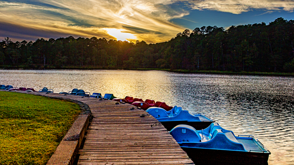 Sunset over the lake. Another summer has come to an end. This photo displays the last remnants of summer as the sun goes down, and all of the paddle boats are secured to the dock. This digital download photograph is 9600px by 7200px and can be printed at any photo lab up to 24" x 32" at 300 dpi. In the near future, we will also be selling signed prints on this site as well as on our online store.